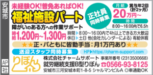 りぼんとは1日の流れ&カレンダー作業風景地図 正社員・パート同時募集中!! ホームページをご覧いただき誠にありがとうございます。 三河安城駅近く、株式会社チャームサポートが運営する就労継続支援B型事業所りぼんでございます。 令和3年2月1日にオープンしました。 在宅支援始めました!!(通所が難しい方は御自宅で作業を行うことができます) 1本の「りぼん」で大切なご利用者様と強い絆で繋がり、その繋がれた「りぼん」はご利用者をそっと優しく包み込むあたたかな関係性を築くことができる「りぼん」でありたいと思ってます。 そんな「りぼん」ribbonで「りぼーん」reborn再生。 ちょっと違う自分に生まれ変わってみませんか~? 株式会社チャームサポート りぼん 〒446-0059 安城市三河安城本町一丁目8番地5 シャルマンビルATEL:0566-93-8125 FAX:0566-93-8126E-MAIL:ribon@charm-support.com